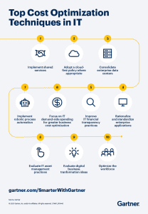 Gartner a făcut o listă de 10 tehnici de optimizare a costurilor IT pe care Chief Information Officer-ii din sectorul privat și public ar trebui să le urmărească și să țină cont de ele pentru a face față constrângerilor bugetare într-un mediu de afaceri volatil.