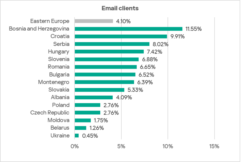 România înregistrează o rată de 6,65%, situându-se peste media regională, alături de țări precum Bosnia și Herțegovina (11,55%) sau Croația, unde emailurile malițioase conțin frecvent documente infectate, spyware sau scripturi periculoase.