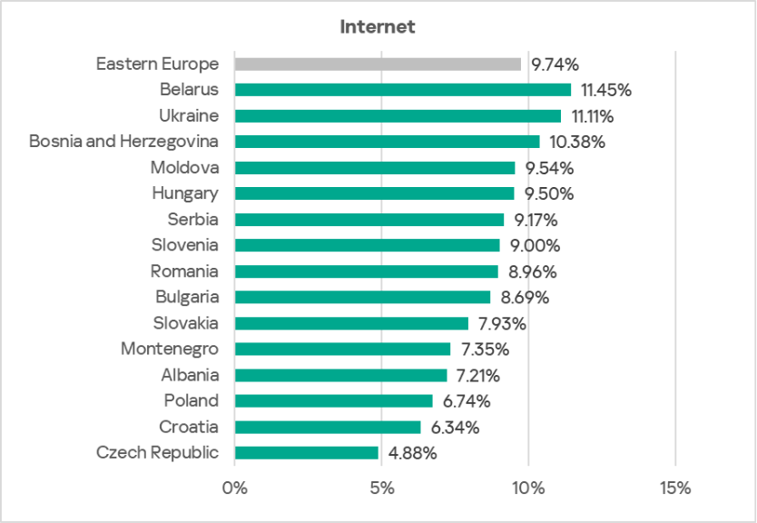 Cu o rată de 9,74% a calculatoarelor ICS pe care au fost blocate amenințări de pe internet, Europa de Est se situează pe locul cinci la nivel global, peste Europa de Vest (6,82%) și de Nord (6,57%), dar sub Europa de Sud (8,35%). Belarus conduce topul țărilor est-europene, cu o rată de 11,45%, urmată de alte țări cu infrastructuri expuse. România se plasează în apropierea mediei regionale de 9,74%, dar sub țări precum Belarus și Ucraina.