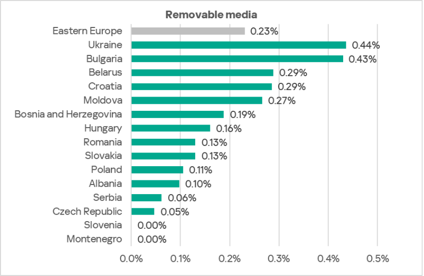 În ceea ce privește amenințările provenite din medii mobile (USB, HDD externe etc.), Europa de Est se află pe locul 7 global, cu un procent de 0,23% din calculatoarele ICS afectate — o valoare de 8,6 ori mai mare decât în America de Nord, regiunea cel mai puțin expusă.