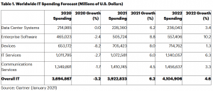 Se estimează că toate segmentele de cheltuieli IT vor reveni la creștere în 2021, așa după cum reiese și din tabelul de mai jos. Se așteaptă ca software-ul pentru zona enterprise să aibă cea mai puternică revenire (8,8%), deoarece mediile de lucru la distanță sunt extinse și îmbunătățite. Segmentul de dispozitive va înregistra cea de-a doua cea mai mare creștere în 2021 (8%) și se estimează că va ajunge la 705,4 miliarde de dolari în cheltuieli IT.