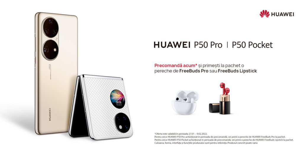 Cele mai recente telefoane lansate de Huawei, P50 Pro și P50 Pocket, continuă seria de inovații în design și mai ales în fotografie, bazându-se pe tehnologia True-Chroma Image Engine, inaugurând astfel o nouă eră a Huawei ImageTM. Cele două modele sunt disponibile pentru precomandă online pe www.huaweistore.ro. HUAWEI P50 Pro vine la prețul recomandat de 5.499 lei și vine la pachet cu HUAWEI FreeBuds Pro Ceramic White, iar HUAWEI P50 Pocket este disponibil la prețul recomandat de 6.499 lei și vine la pachet cu HUAWEI FreeBuds Lipstick. De asemenea, până la sfârșitul lunii februarie, cumpărătorii produselor din seria P pot achiziționa serviciul de garanție extinsă pentru 1 an la jumătate de preț.