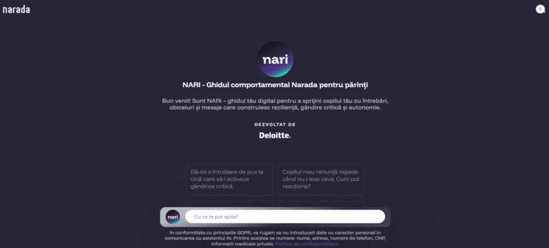 „Credem că educația adevărată nu e doar despre materii, ci despre cum înveți să fii om în fața dificultăților. Nari este răspunsul nostru la o nevoie profundă: aceea de a pune știința la dispoziția celor care cresc copii. Nari este un AI creat deopotrivă cu inima și mintea. Iar alături de echipa de voluntari din cadrul Deloitte Technology Delivery Center, ne-am convins că viitorul poate fi scris de oameni care aleg să se implice”, precizează Bianca Apostu, Manager Proiecte și Tehnologie la organizația Narada.