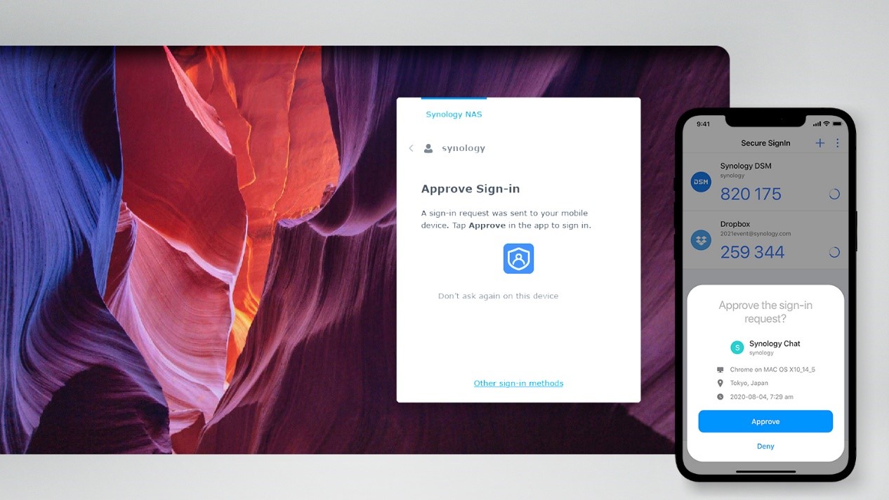 În DSM 7.0, autentificarea este mult mai flexibilă datorită Synology Secure SignIn, o nouă aplicație mobilă care permite administratorilor de sistem să securizeze conturile fără efort. Folosind Secure SignIn, utilizatorii pot elimina parolele, autorizând cererile de conectare direct de pe telefoanele lor. De asemenea, Secure SignIn poate fi utilizat şi ca metodă de autentificare secundară în modul de conectare cu doi pași.
