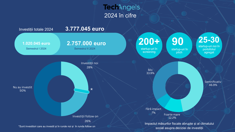 Investitorii din grupul TechAngels, cea mai experimentată rețea de investitori tip angel din România, au înregistrat o creștere de aproape trei ori a investițiilor în a doua jumătate a anului 2024, ajungând la 2,757 milioane de euro investite direct în startup-uri tech. Suma totală a anului se ridică astfel la 3,777 milioane de euro, marcând o creștere cu 25% față de 2023.